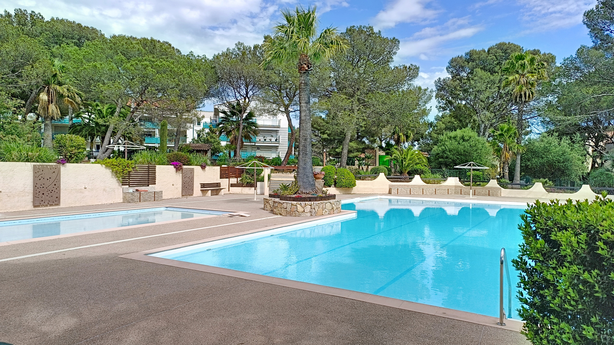 Andélim Agence du Bord de Mer - 04 83 12 13 57. Dans une résidence de standing, sécurisée et très recherchée, avec deux piscines, gardien et un superbe parc paysager, découvrez ce magnifique deux pièces de 53 m2 en parfait état. L'appartement offre une spacieuse pièce de vie avec cuisine entièrement équipée et aménagée, une chambre avec placard, toutes deux s'ouvrant sur une vaste terrasse de 24 m2, véritable espace de vie supplémentaire, une salle de bains et des toilettes séparées. Une place de stationnement en sous-sol (boxable) et une cave complètent ce bien. Un cadre de vie privilégié, entre confort, calme et douceur méditerranéenne.<br />