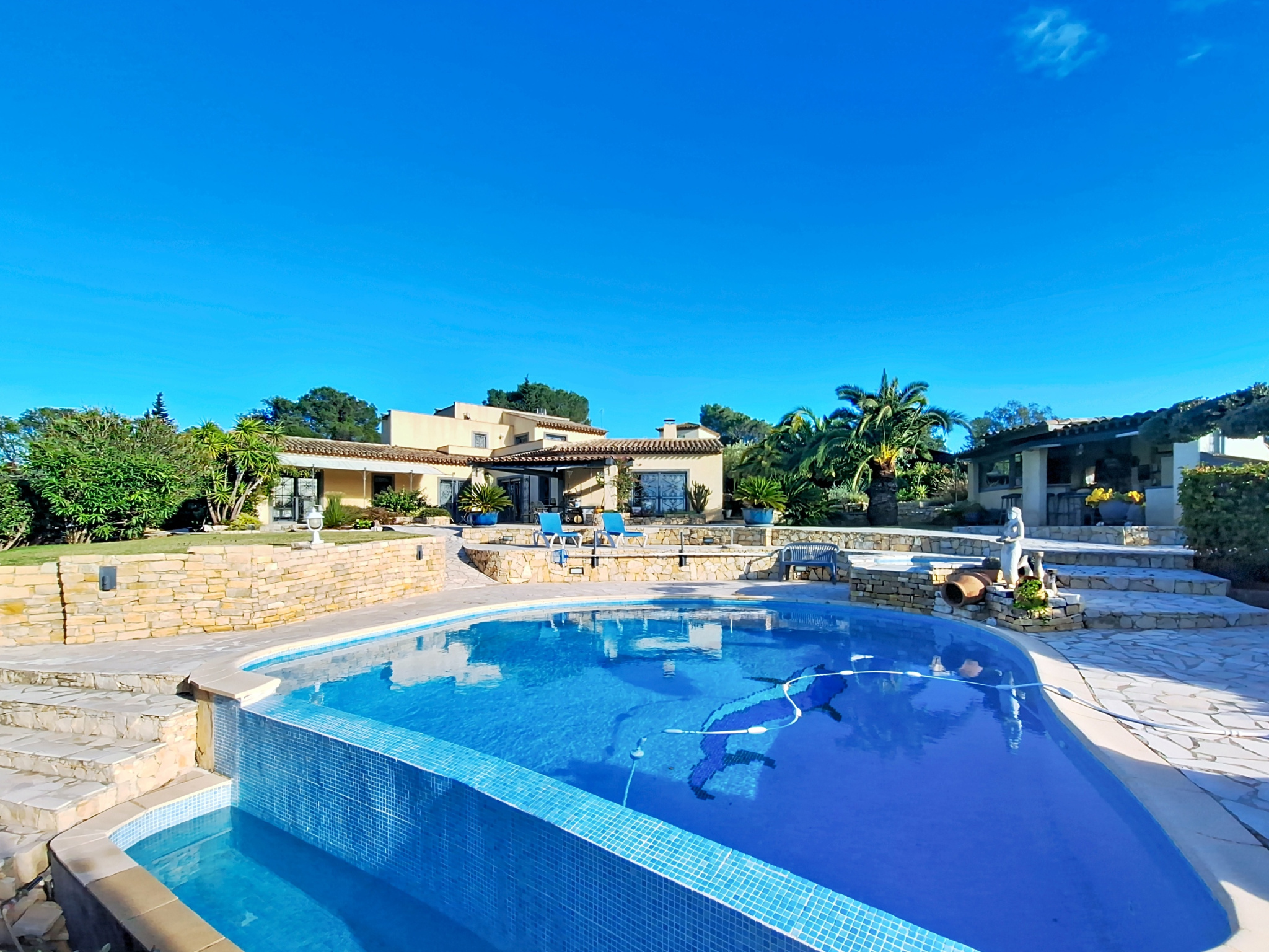 Position dominante, vue dégagée sur une coulée verte, une très belle adresse en plein coeur du quartier Valescure. Cette maison principalement de plain pied se compose d'une pièce à vivre séjour / coin feu / cuisine / salle à manger, une suite parentale avec salle de bains + douche, 2 chambres et salle d'eau, buanderie. Cave en sous-sol 50 m2. Garage et dépendance aménageable 50 m2. Les extérieurs sont superbement paysagés, piscine à débordement / jaccuzzi, terrasses, terrain de pétanque et cuisine d'été. <br />